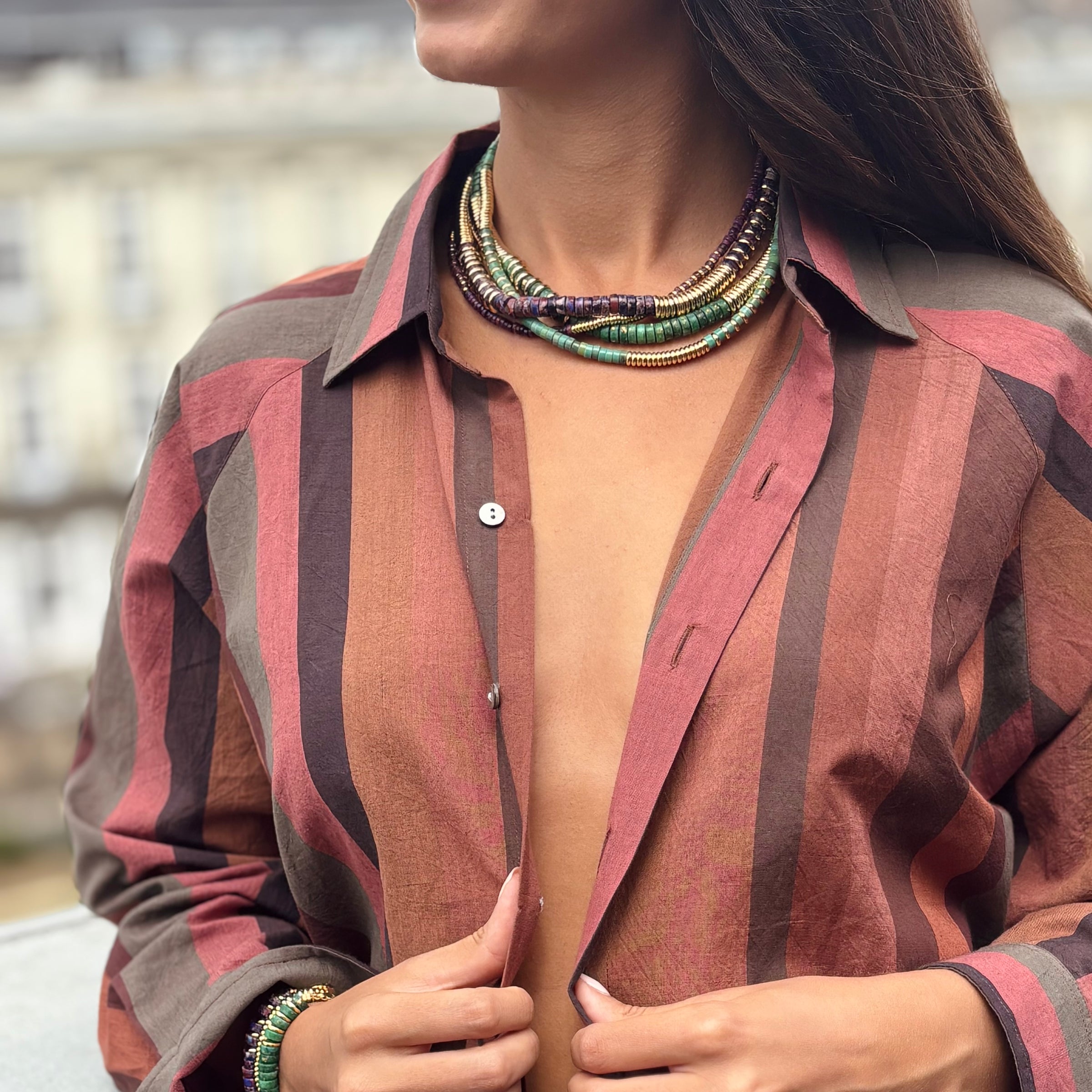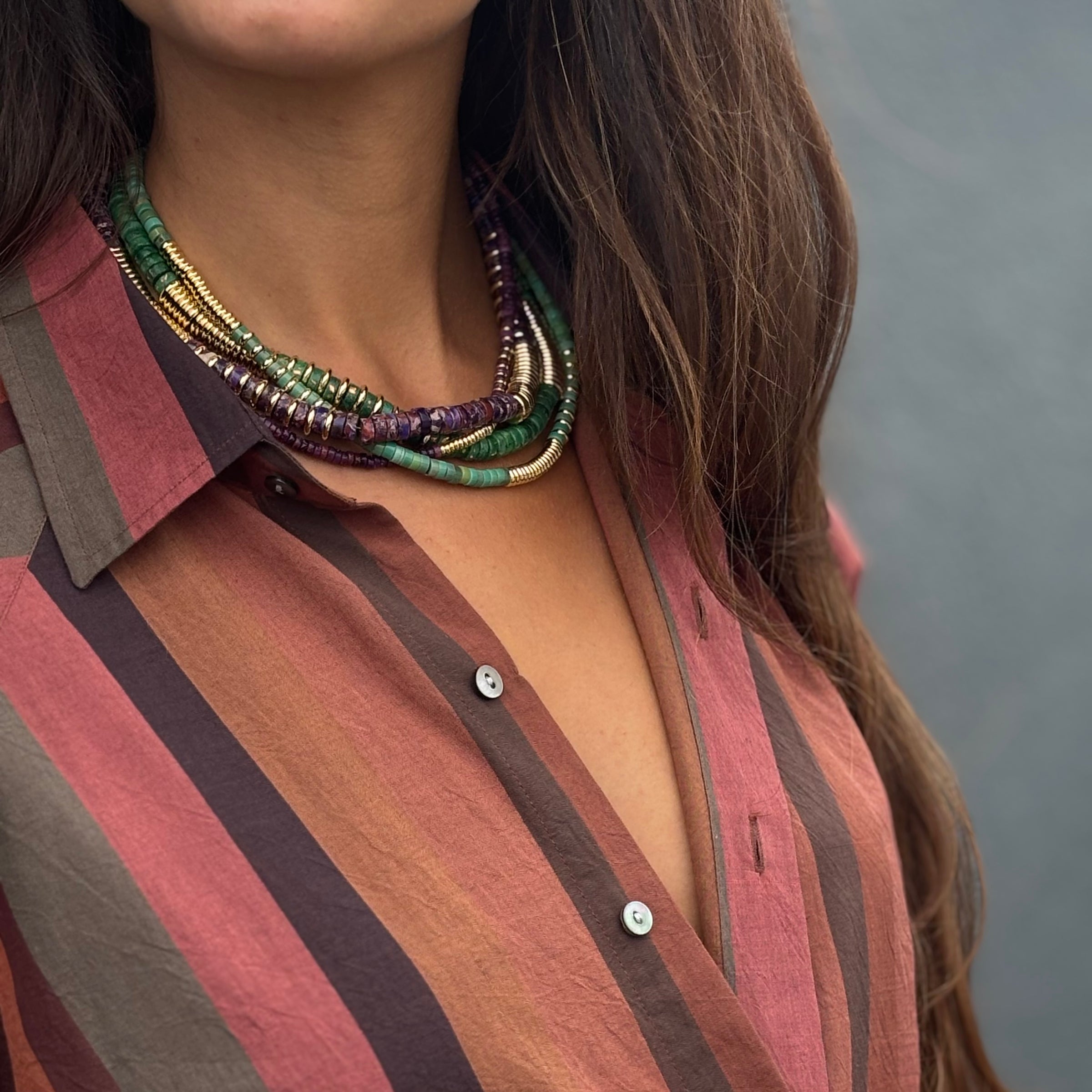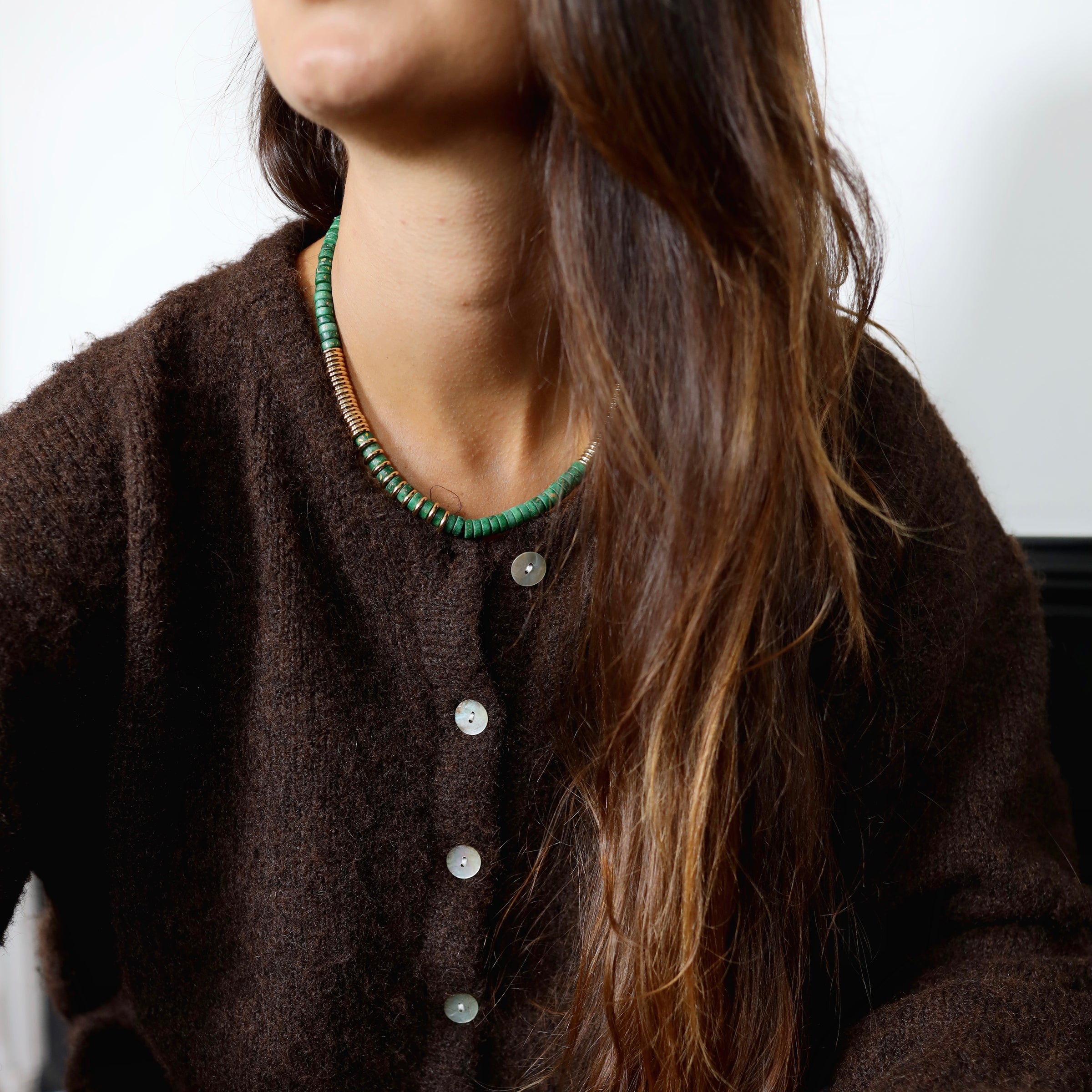 Description : Collier emblématique de la marque Tyhamo réalisé avec des perles Heishi en Dolomite & Opale teintée Vert. Les Heishi sont des perles rondes et plates.