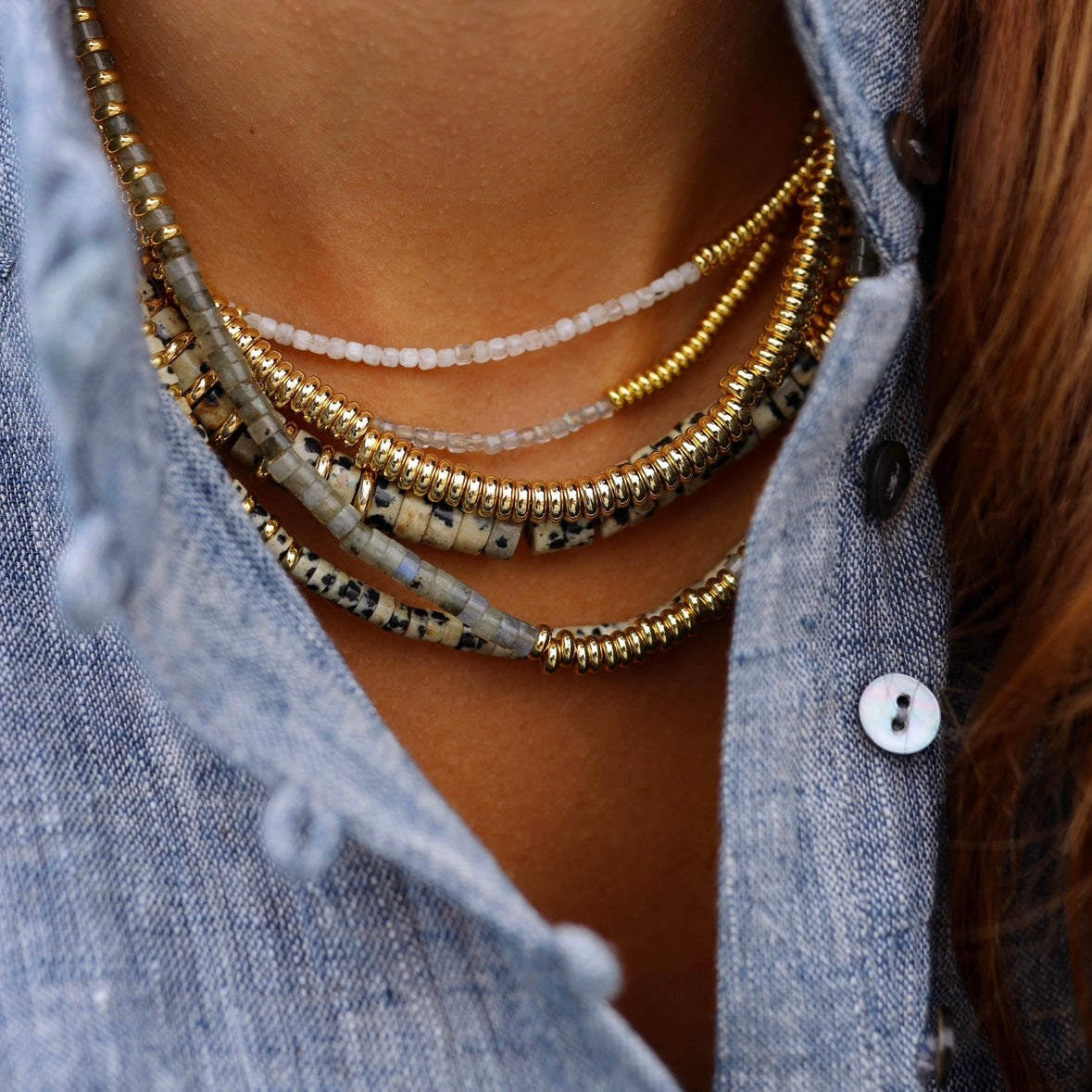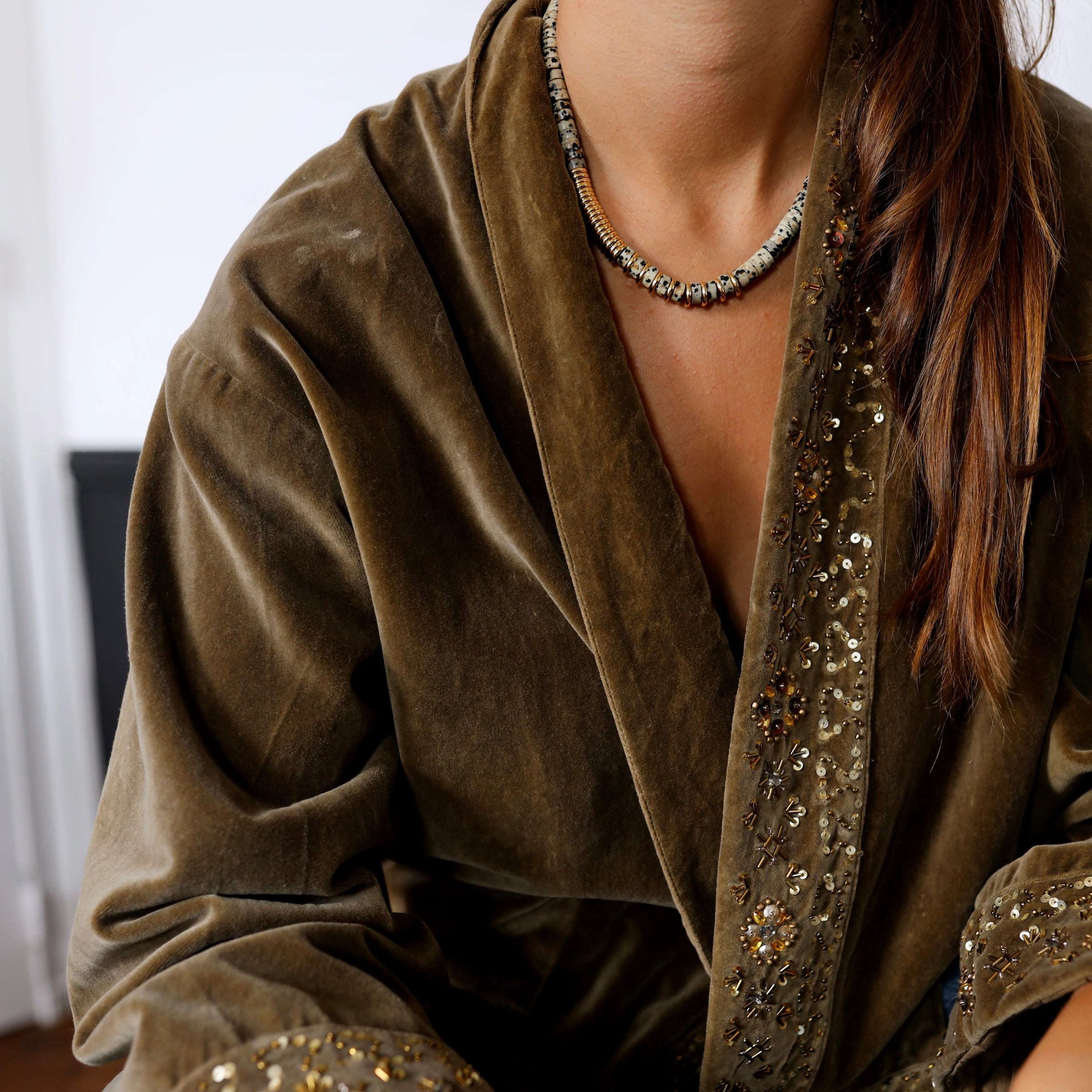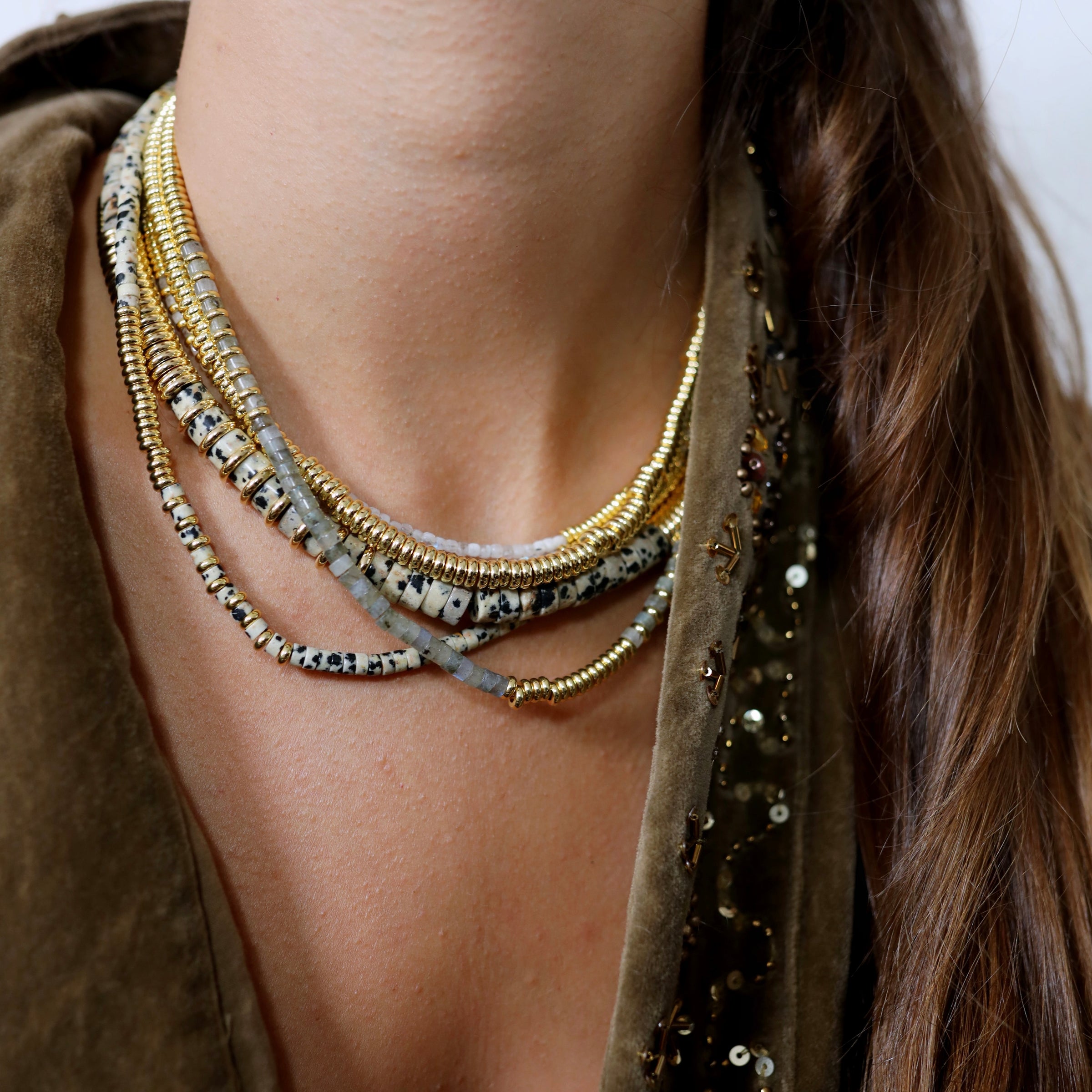 Description : Collier emblématique de la marque Tyhamo réalisé avec des perles Heishi en Jaspe Moucheté. Les Heishi sont des perles rondes et plates.
