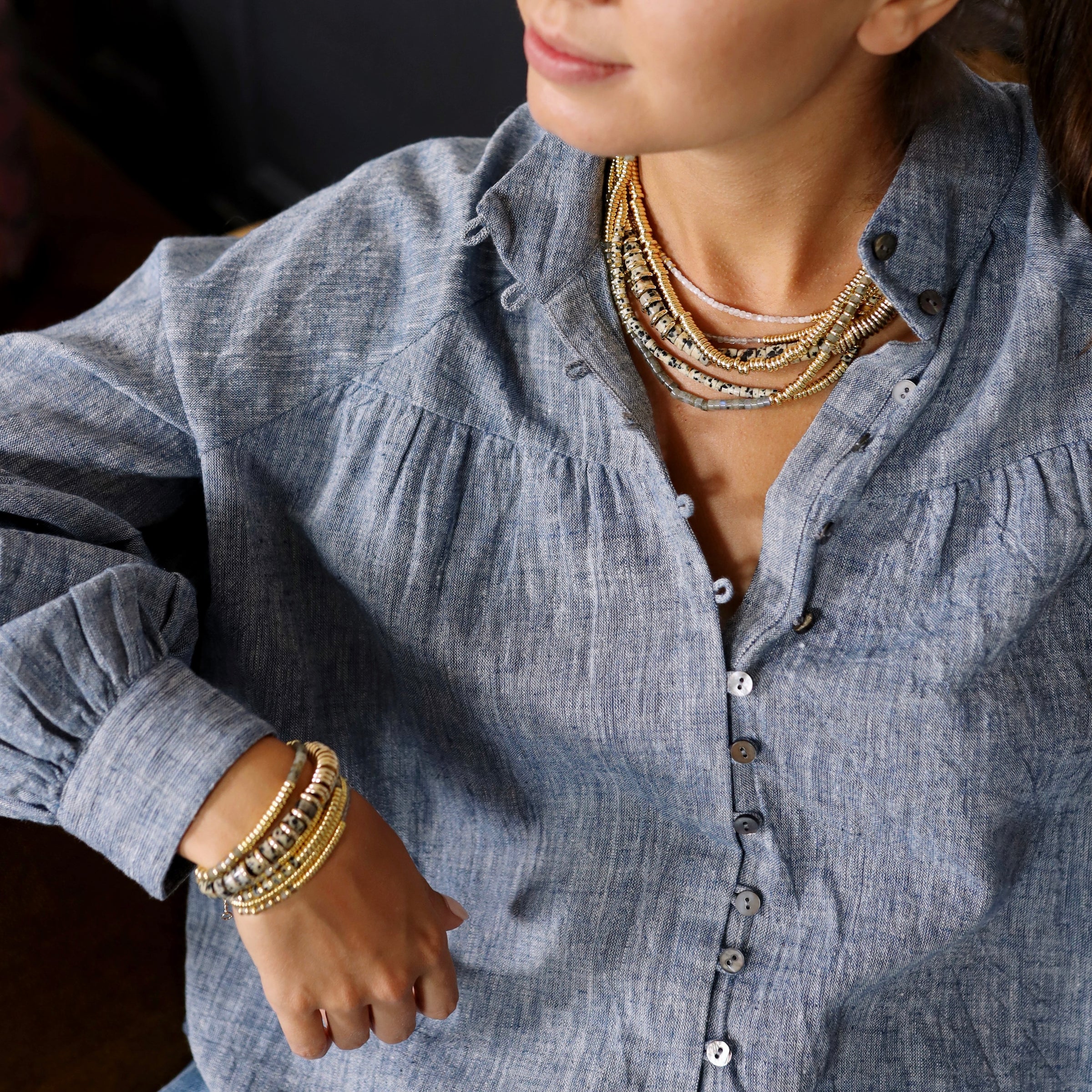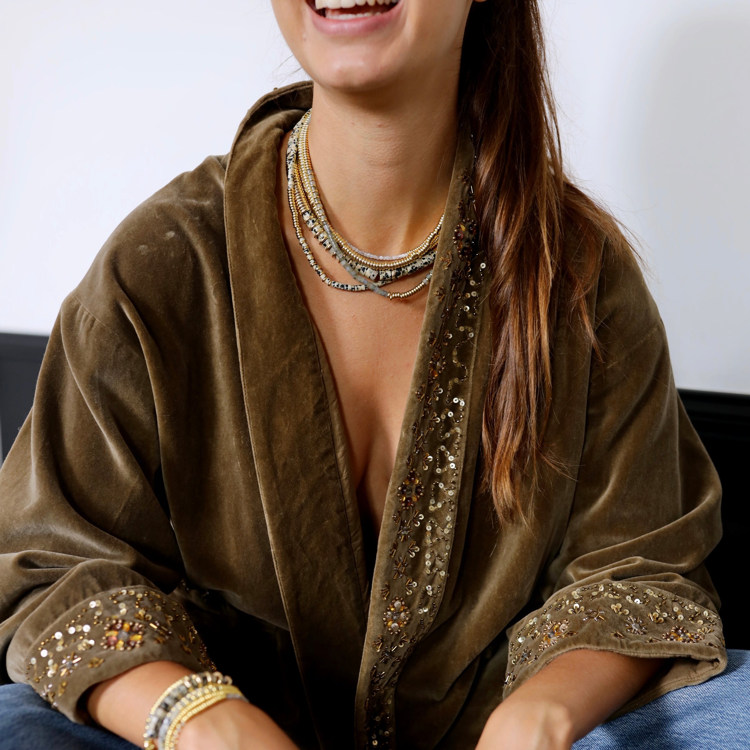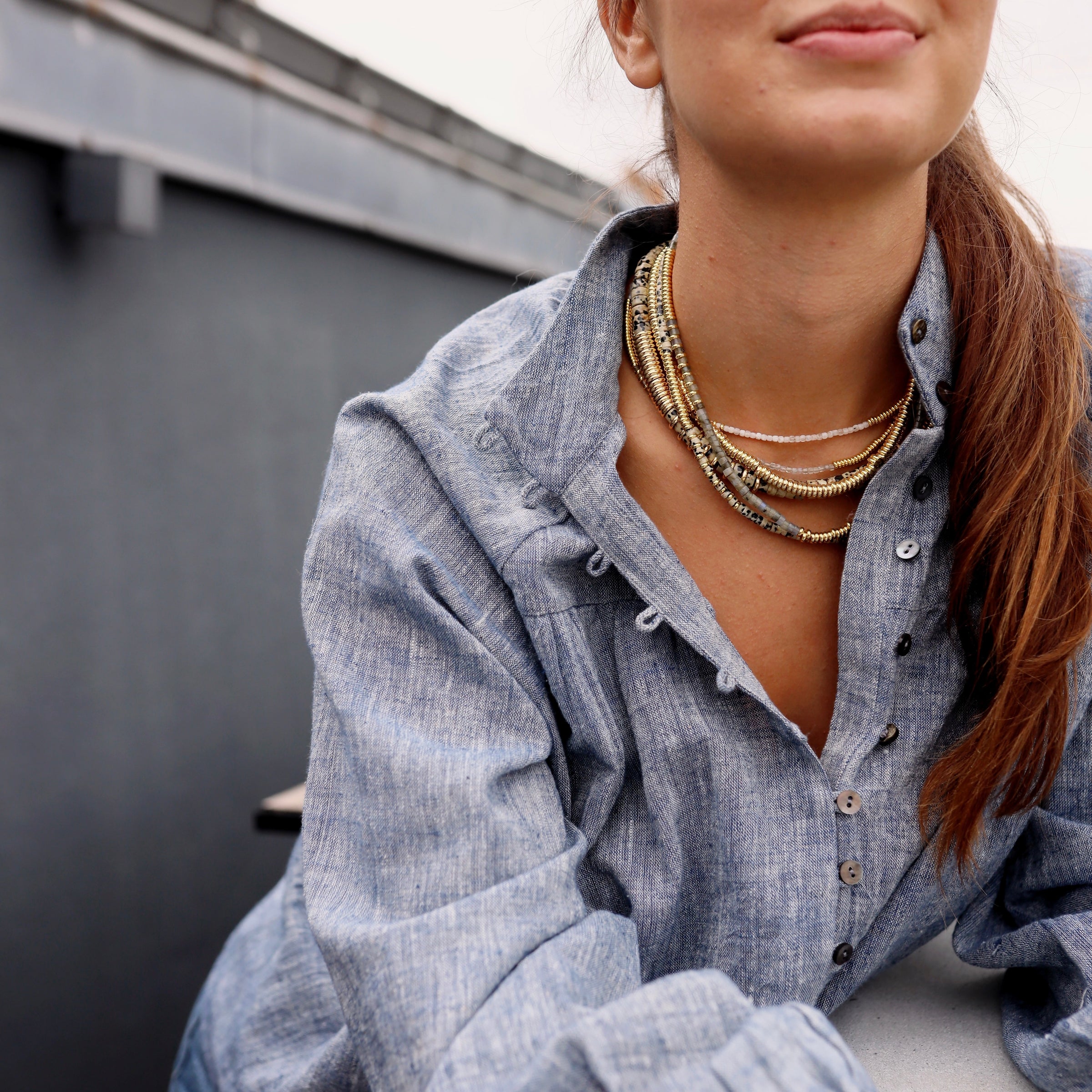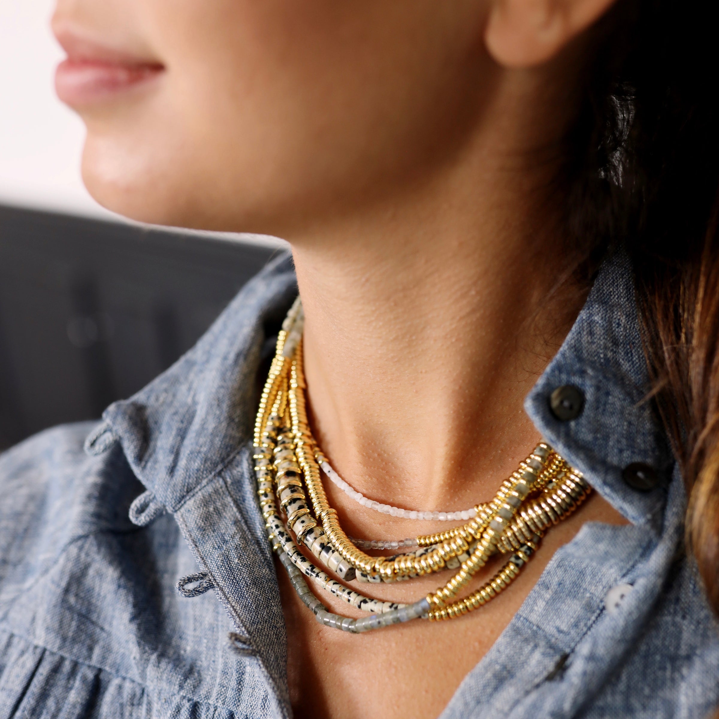 Description : Collier emblématique de la marque Tyhamo réalisé avec des perles Heishi en Jaspe Moucheté. Les Heishi sont des perles rondes et plates.