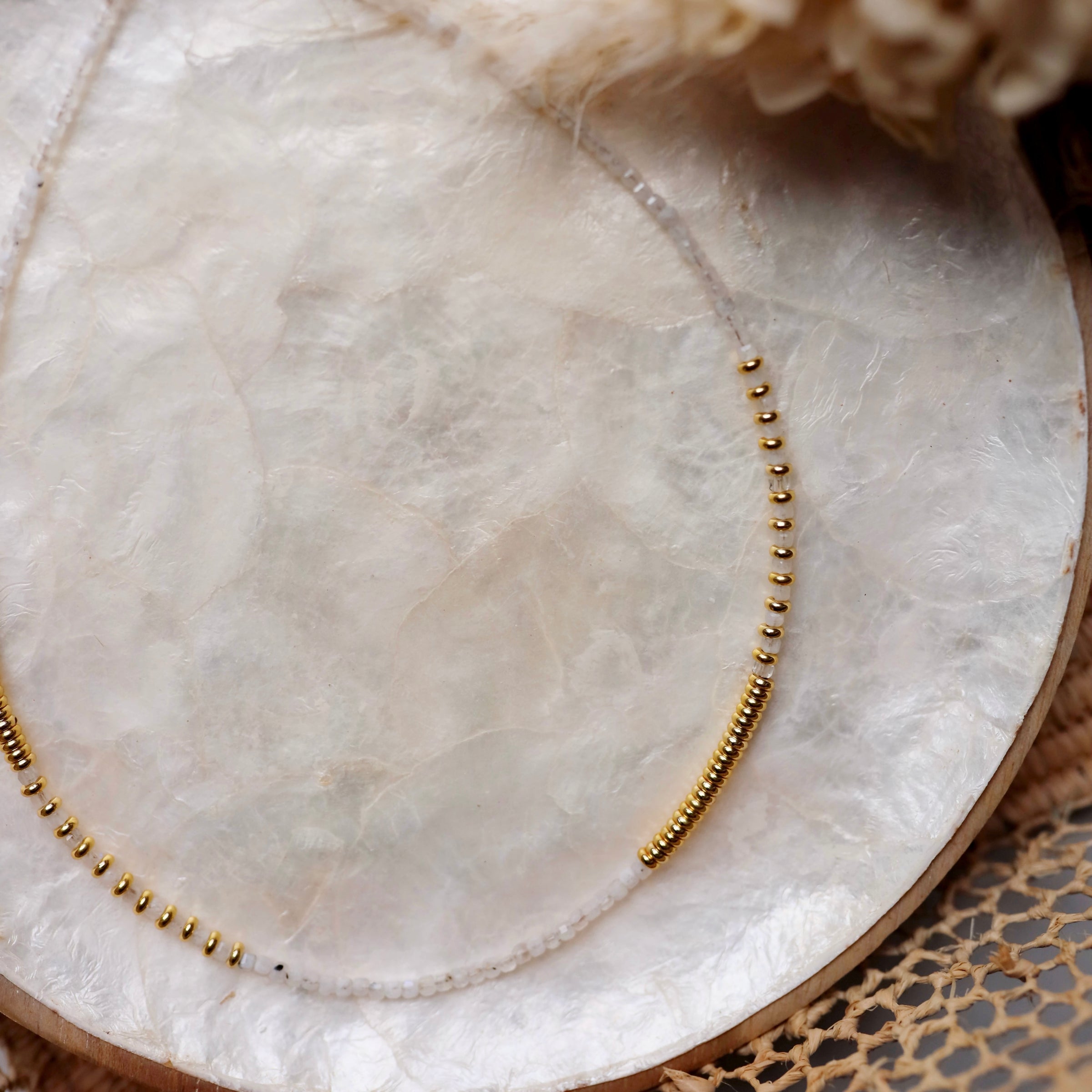 Description : Collier emblématique de la marque Tyhamo réalisé avec des pierres fines en Pierre de Lune carrées 2,5x2,5mm.
