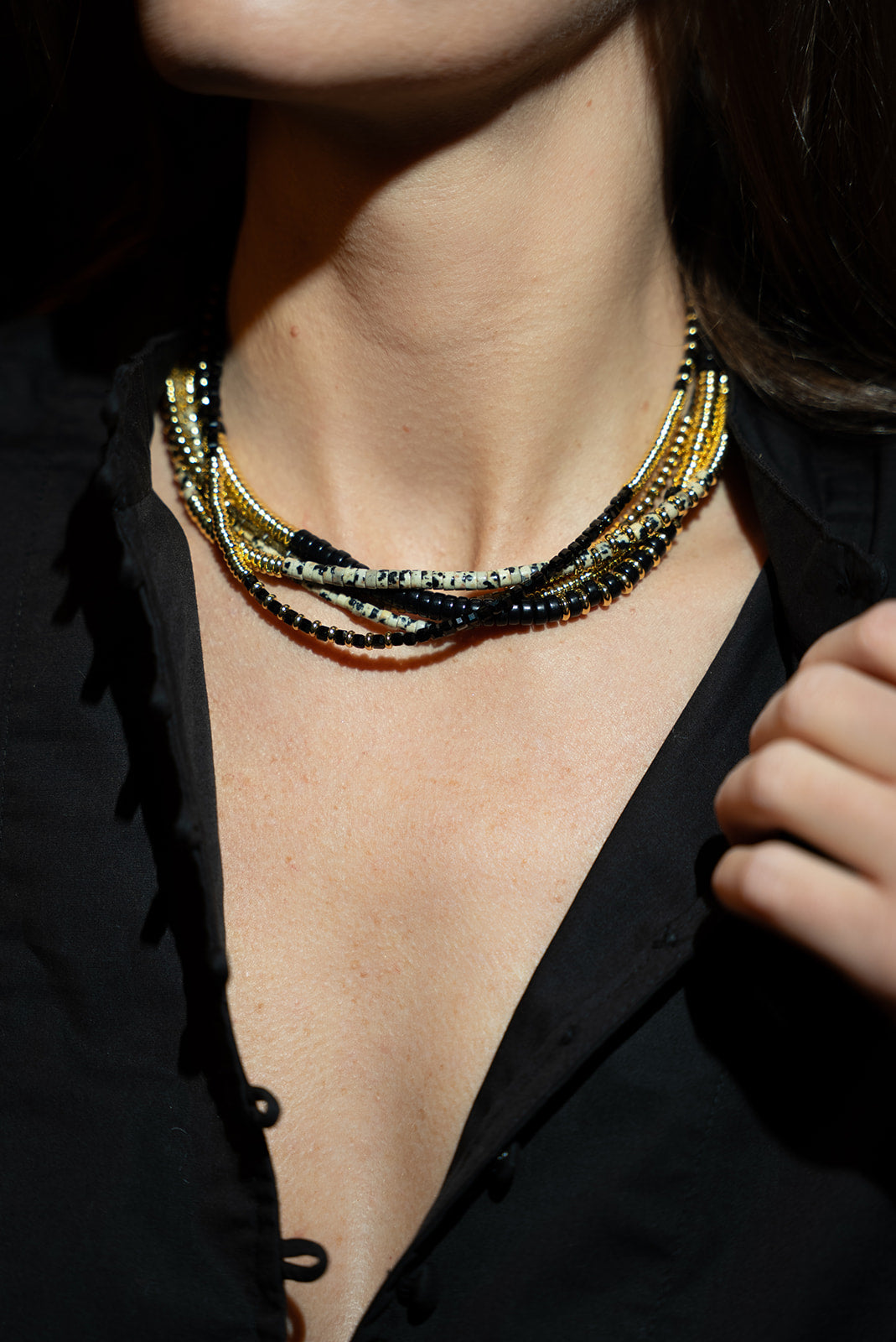 Description : Collier emblématique de la marque Tyhamo réalisé avec des perles en Quartz Noir (2/3mm).
